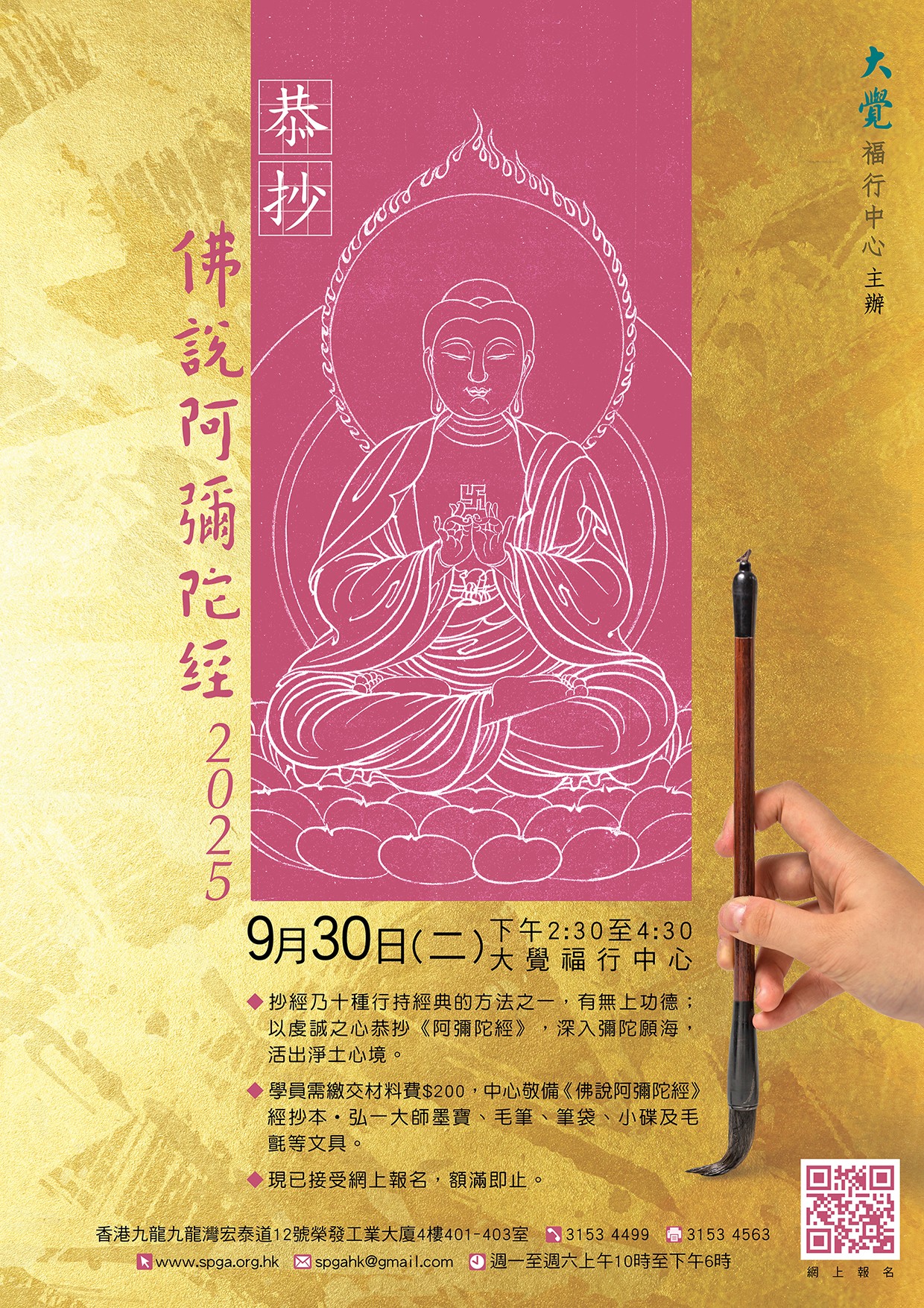 抄經乃十種行持經典的方法之一,有無上功德;以虔誠之心恭抄《阿彌陀經》,深入彌陀願海,活出淨土心境。