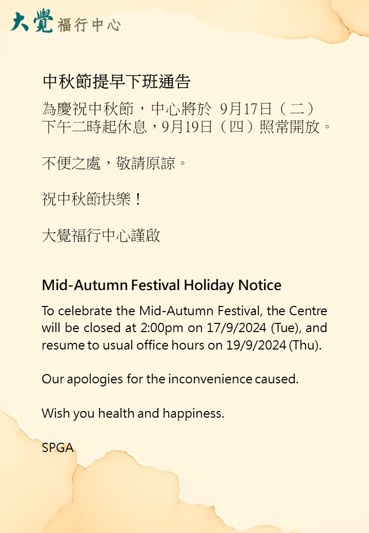 為慶祝中秋節,中心將於 9月17日(二)下午二時起休息,9月19日(四)照常開放。